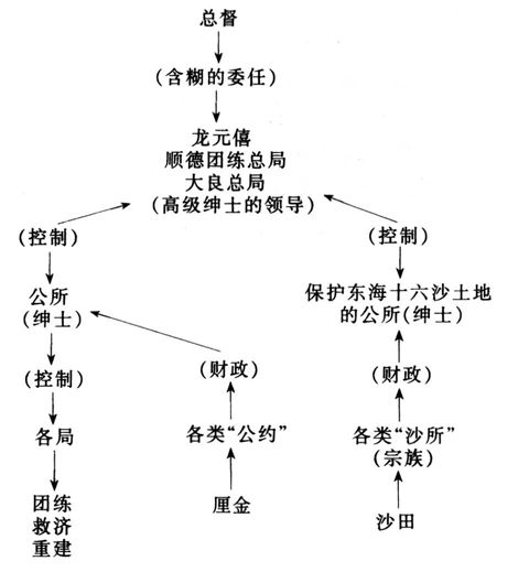 现在这一切都改变了。新的顺德团练总局——当地人称之为大良公局——吸收了团练,并把“沙所”改变为单纯的财政组织,它把宗族沙田的地租输集到总局。[157]绅士就这样控制了宗族的财源。他们还发展了一种新的敛财方法,使他们得以部分地独立于低级的“沙所”。这一新的税源就是“厘金”:对商品征收的过往税。大良公局下属的每一个局都担负经管资金以雇用练勇、赈济、重建乡学等等职责。每一个局都有一个相应的“公约”,它向“局”提供所需费用,而各“约”则在县城周围和主要的商业市镇设立税卡以获得这些资金。[158]未使用的收入重新投资于沙田。富有的绅士把越来越多的肥沃的淤积土地加入本族的族产中,它们在名义上为当地公局所有。总局每年的租金收入达2万两。无疑,这些钱表面上用于公共事业,实际上则被掌管总局的绅士占有。1889年,一个官员私下告诉当时的总督张之洞,设于东莞县孔庙的一个类似的公局是如何处理它的财产的:“我已调查了东莞县孔庙的土地和财产。虽然(这些财产)属于县里的绅士公所,但并没有完全用于乡学。许多(财产)都被地方大族的绅士和官员暗地里侵吞了”[159]。但是,要制止这种过分的行为已为时太晚。17世纪时地方官曾直接控制“沙所”,而现在总督仅仅指定团练局的领袖;由于过分地依靠他们的社会支持,已不能约束他们的侵吞行为。虽然富有者对权力的传统渴望已由于对农民叛乱的恐惧而抵消;但现在,“危险的阶级”实际上已被叶名琛的清洗扫除了,广州的绅士在社会上已没有什么对手。再说,一个地方官怎么敢对像龙元僖这样的人逃避土地税或非法地审问罪犯及土匪的行为提出异议呢?