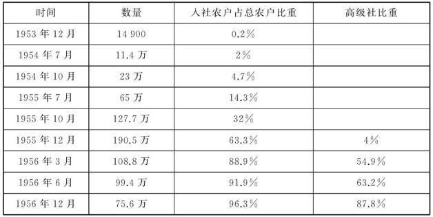 合作化是一个多么美好的设想啊!一切都有组织去操心,自己只需要享受劳动的快乐和消费的快乐就行了。按“理”说,人们应该是趋之若鹜的,但是情况可能与理想有些差距,合作社的发展速度是不尽如人意的。1950年,我国只有19个农业生产合作社,其中初级社18个,高级社1个。1951年底发展到130个,其中初级社129个,高级社还是1个。到1953年12月16日中国共产党中央发布《关于发展农业生产合作社的决议》的时候,农业生产合作社已经发展到1.5万个,其中初级社1.5万个,高级社15个。但是在这之后,农业生产合作社的数量就开始突飞猛进地发展起来,1954年,农业合作社发展到11.4万多个,而高级社只有200个。