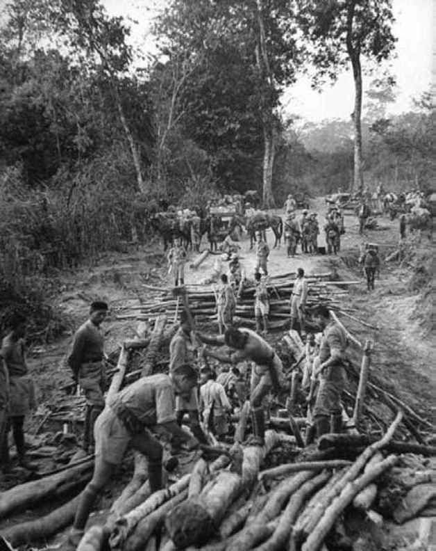 打通胡康河谷西口后,向孟关边修路边前进的远征军部队。