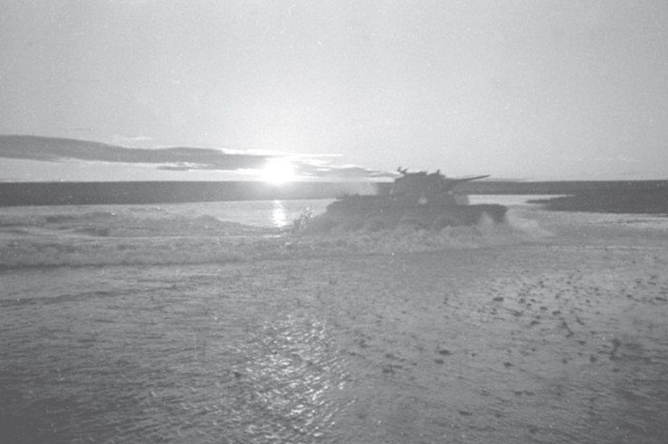 一辆苏军坦克正从哈拉哈河的浮桥上通过,远处是一轮红日,画面极具美感。