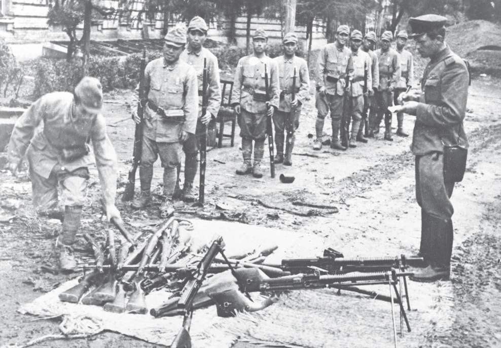一名苏军士兵正在为投降缴械的日军士兵进行武器登记。从表情上看,这些日本兵都很轻松。不过虎头、东宁要塞的日军显然不在此列。