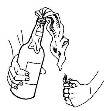 你可以用任何易碎器皿和易燃液体勾兑,引起一场大火。这是一种经济实惠歼灭僵尸群的有效措施。可以的话,用大火将它们彻底烧作灰烬——比如你想歼灭行进中的僵尸群,清空一座耐火的建筑,或是一举消灭所有聚集在可燃建筑中的僵尸队伍,甚至是你想方设法要处理掉那些危险尸体的时候。