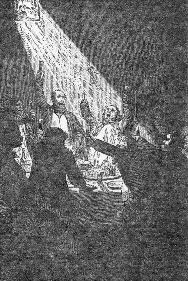 宴席上气氛热烈,甚至可以说有些喧闹。大家互相敬酒,为了地球、为了卫星、为了大炮俱乐部、为了国家、为了月亮、为了狄安娜、为了福柏、为了赛莱娜、为了“天空的和平使者”,大家不停地干杯。高声的欢呼被声波顺着这个巨大的传声筒传到了炮口,像雷鸣一般。聚集在乱石岗周围的人群也心驰神往地随着躲在大炮下面的聚餐者们共同欢呼。