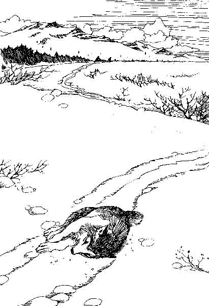 但是,它一直坚持走到了扎营地,于是车夫给它在火堆旁安了个地方。早上,它已经虚弱得无法行走。在套挽具的时候,它拼命爬到它的车夫脚旁。它颤抖着身子,拼命打着趔趄站起来,然后又倒下了。于是它缓慢地向前,朝着它的伙伴们正在套绳索的地方过去。它抬起前腿,乘势将它的身体拖向前,然后它再提起前腿,再往前拖几英寸。它的力气耗尽了,伙伴们所看到它的最后情景是,它正躺在雪地上,一面喘气,一面恋恋不舍地望着它们。但是,直到它们消失在一条河边树林的后面,依然还能听到它忧伤的长嚎。