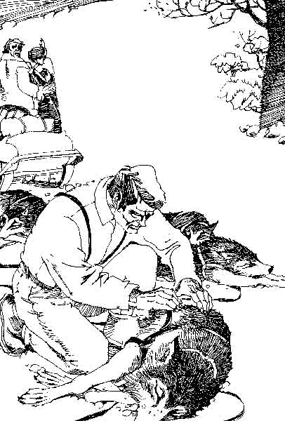 桑顿挡在他和巴克之间,表示他不想走开。哈尔拔出他的长猎刀。默西迪丝一边尖叫,一边哭,一边还在哈哈大笑,纯粹是一副歇斯底里的混乱与疯狂。桑顿用斧头把敲打哈尔的指关节,敲得猎刀落在了地上。哈尔想捡起刀,他又一次打他的指关节。然后,他弯下身子,自己把刀捡了起来,他上前两刀,把巴克的挽绳割断。